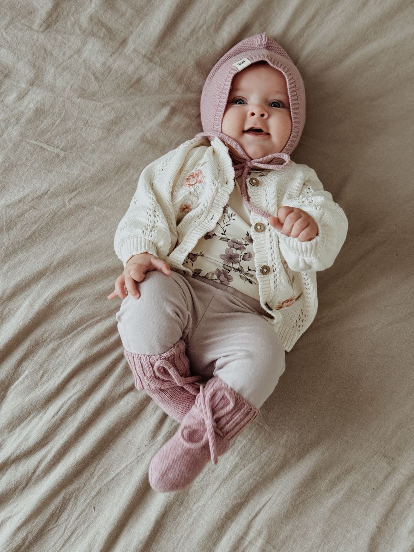Unsere Mützen und Boots sind ab Geburt geeignet und wachsen bis in den 12 Monat mit (je nachdem wie groß dein Baby ist und wie schnell es wächst kann die Kleidung auch nur bis zum 9. Monat passen).